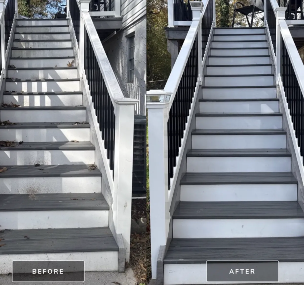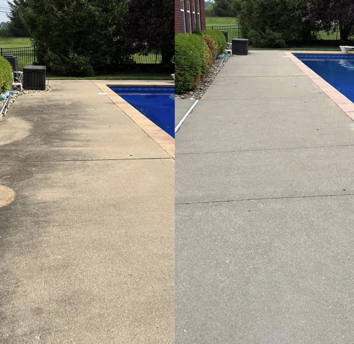 Pressure washing uses higher water pressure to clean durable surfaces like concrete, driveways, and sidewalks. Soft washing uses low pressure combined with safe cleaning solutions to clean roofs, siding, and delicate surfaces without causing damage. We choose the best method based on your property and surface type.